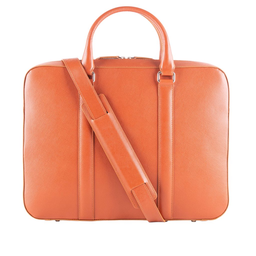 Courroie cognac pour notre sacoche pour ordinateur portable John & Paul. Cuir Saffiano, rembourrage à l'épaule, ferrures italiennes.