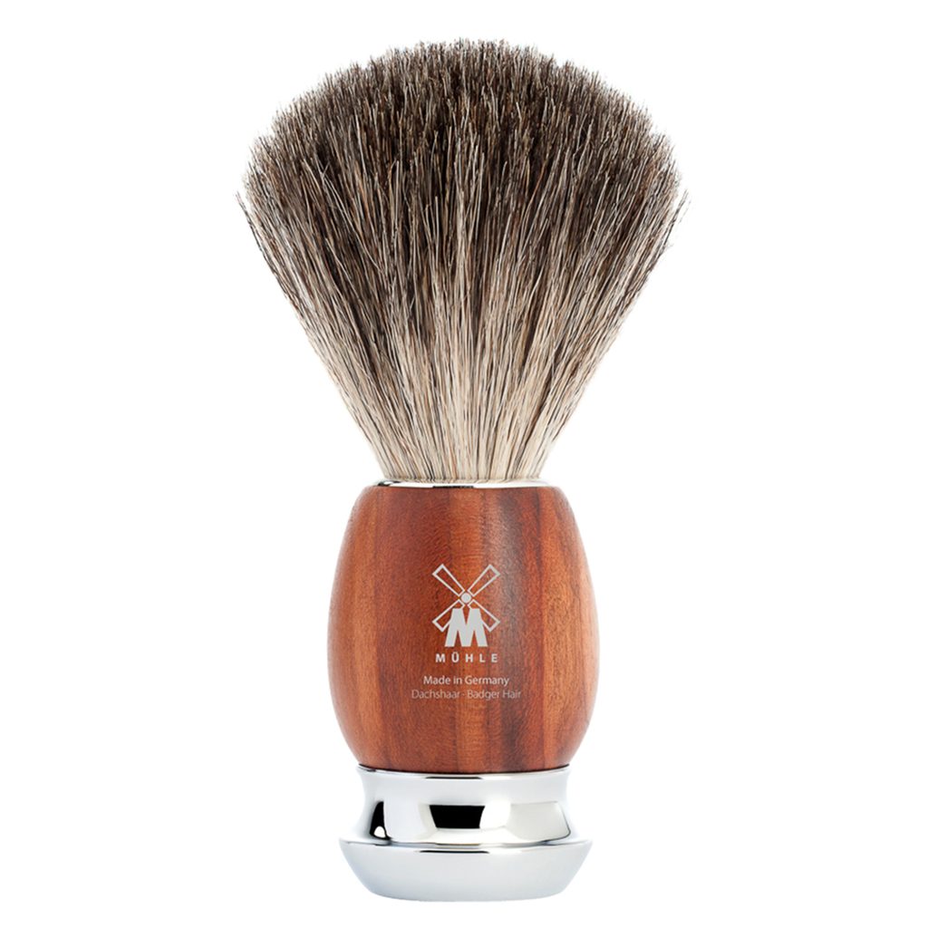 Blaireau de rasage Mühle VIVO de forme moderne avec un manche en bois de prunier traité à l’huile en poils de blaireau de qualité pure badger. Ce sont les poils de blaireau les plus durs, mais ils sont tout de même un choix souple et agréable. Lors de l’application de savon ou de crème, ils vous masseront agréablement.