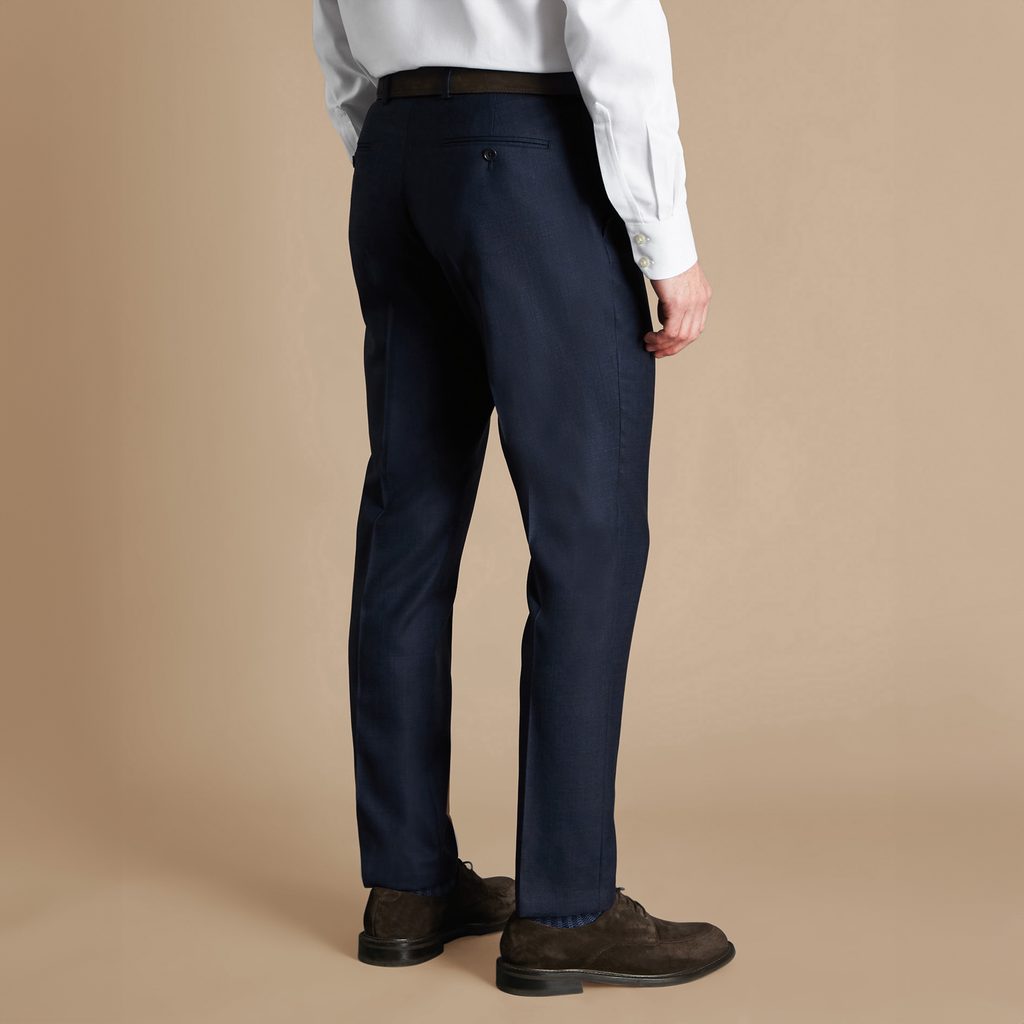 Pantalon de costume bleu foncé cousu dans une fibre Super 120s plus fine et une birdseye weave à pois. Il s'agit d'une pièce minimaliste avec un devant plat (le pantalon n'est donc pas cousu, il n'y a pas de pattes) et une longueur de doublure à mi-genou. Il est naturellement doté d'une fermeture à boutons typiquement française, c'est-à-dire d'un bouton qui se chevauche.