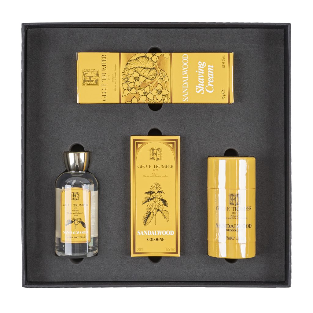 Un élégant coffret cadeau rempli de produits du légendaire fabricant londonien Geo. F. Trumper, avec un parfum uniforme de bois de santal.