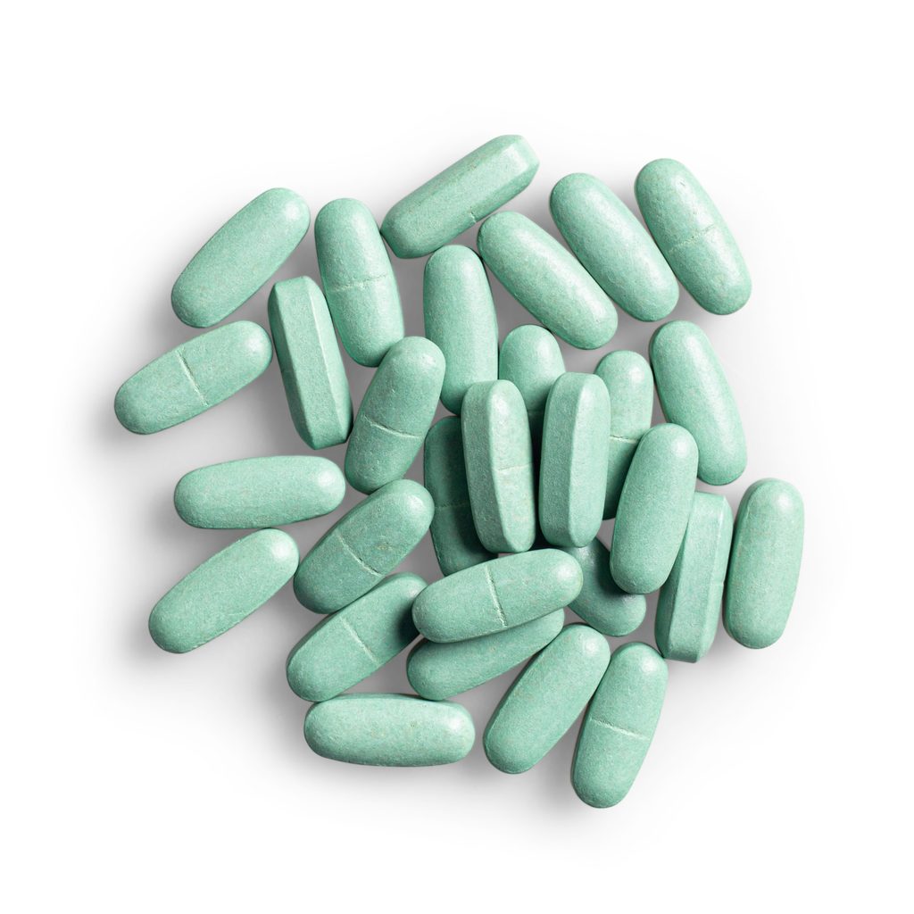 Bulking agent (microcrystalline cellulose, dicalcium phosphate, tricalcium phosphate). Horsetail extract (Equisetum arvense L.), ascorbic acid, calcium-D-pantothenate, L- cysteine, L-methionine. Glazing agents (polyvinylpyrrolidone, sodium carboxymethyl cellulose, hydroxypropyl methylcellulose, magnesium salts of fatty acids, polyethylene glycol, rice starch, sucrose esters of fatty acids, hydroxypropyl cellulose, beta-cyclodextrin). Selenium-L-methionine, zinc oxide. Color (Chlorophylline sodium-copper complex E141(ii)). Thiamine mononitrate, pyridoxine hydrochloride, retinyl acetate, D- biotin, niacin, riboflavin, cyanocobalamin, copper sulphate, folic acid.