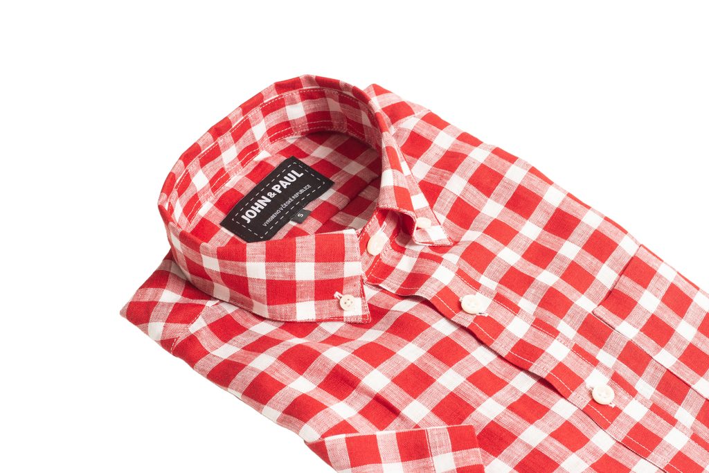 Nous avons mis le paquet pour notre collection estivale de chemises John & Paul. Voici donc la toute première série de nos chemises, dont certaines à manches courtes. Pour les barbecues estivaux, les vacances et les festivals, même nous, les puritains, considérons que c'est acceptable. Ce modèle rouge et blanc en 100 % lin est doté d'un col souple, d'une poche de poitrine et d'une coupe plus ample et plus courte qui permet de le porter hors du pantalon.