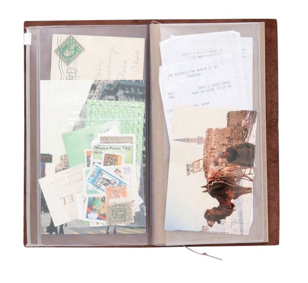 Pochette fermable conçue pour le carnet de voyage Traveler’s Notebook. Il suffit de la mettre à l’arrière de la couverture du carnet et de plier l’autre moitié.