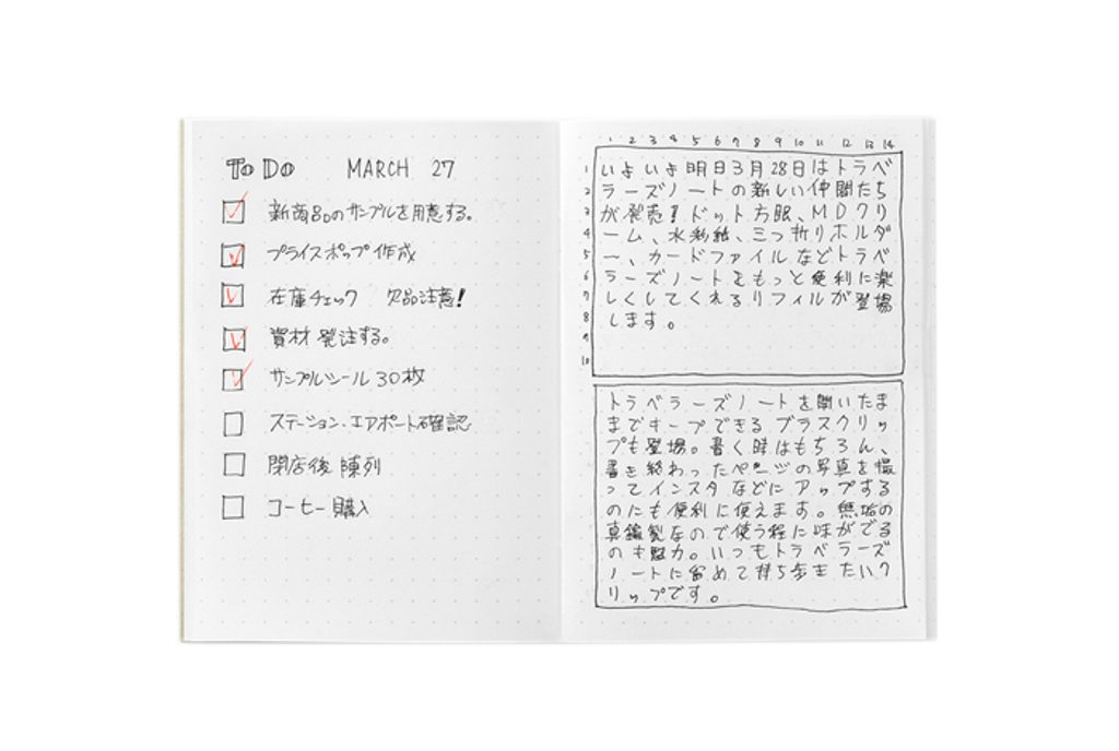 La recharge à pointillés tant attendue le carnet de voyage Traveler’s Notebook. Petit point technique : la distance entre les points est de 5 mm. Le nombre de pages est de 64. Le papier est japonais et à grammage élevé. Il est également agréable d’écrire dessus avec un stylo plume. Les dimensions sont de 124 x 89 mm, ce qui convient à la version réduite Passport.