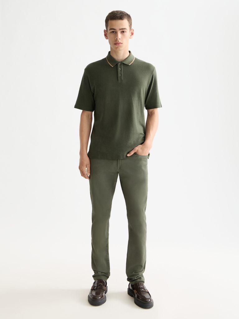 Polo classique de couleur vert foncé qui se distingue d'un t-shirt ordinaire grâce à sa texture fine et son col contrasté discret. Il est à la fois sportif et élégant, ce qui lui permet de s'adapter aussi bien à une promenade le week-end qu'au bureau, où la chemise n'est pas encore de mise.