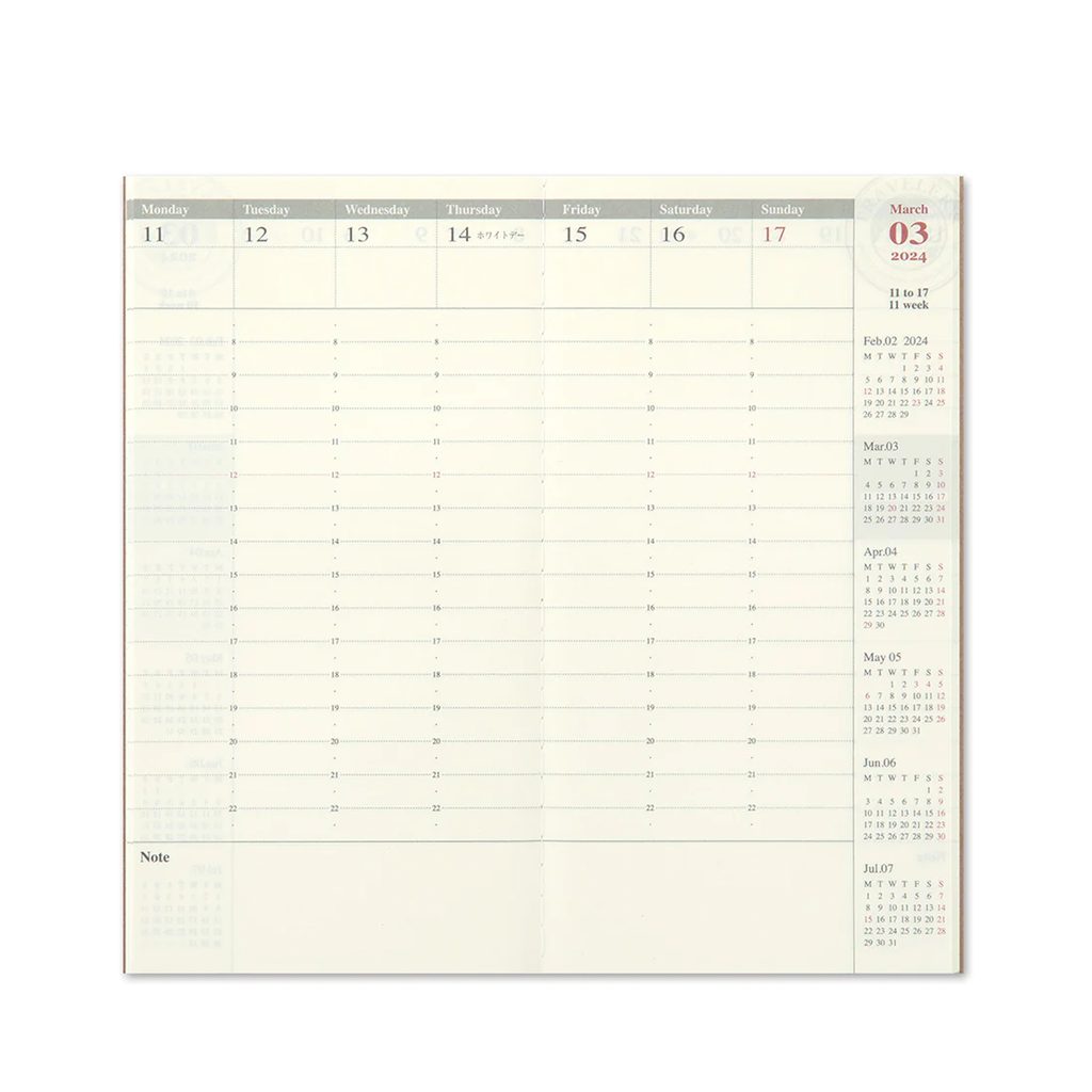 Un agenda hebdomadaire soigné au design à colonnes. Celui-ci est au format classique plus grand et peut bien sûr être inséré dans n'importe quel carnet TRAVELER'S du même format.